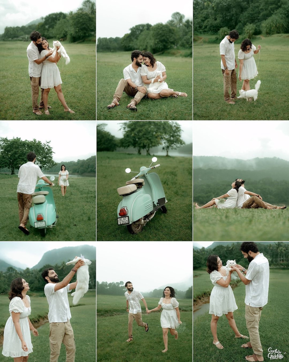 In the first shot, the couple is seen sitting on an open green field, dressed in relaxed, coordinated outfits of whites and neutrals. With soft expressions and cozy postures, they hold their adorable pet, which adds an element of playfulness and warmth to the picture. The natural greenery around them, paired with their casual, romantic setup, makes this an unforgettable frame.