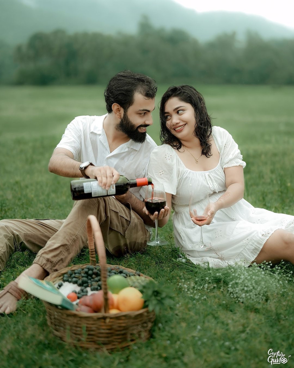 The third setup features a charming picnic scene with a basket of fruits, wine, and open-hearted smiles. The couple relaxes barefoot on the grass, sipping wine and enjoying each other’s company. This scene is reminiscent of an intimate, carefree picnic date in nature, capturing the couple’s lighthearted moments as they share laughs and create memories.